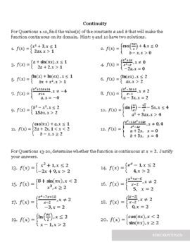 Students Will Complete A Worksheet That Discusses Continuity And Differentiability Of Each Function.